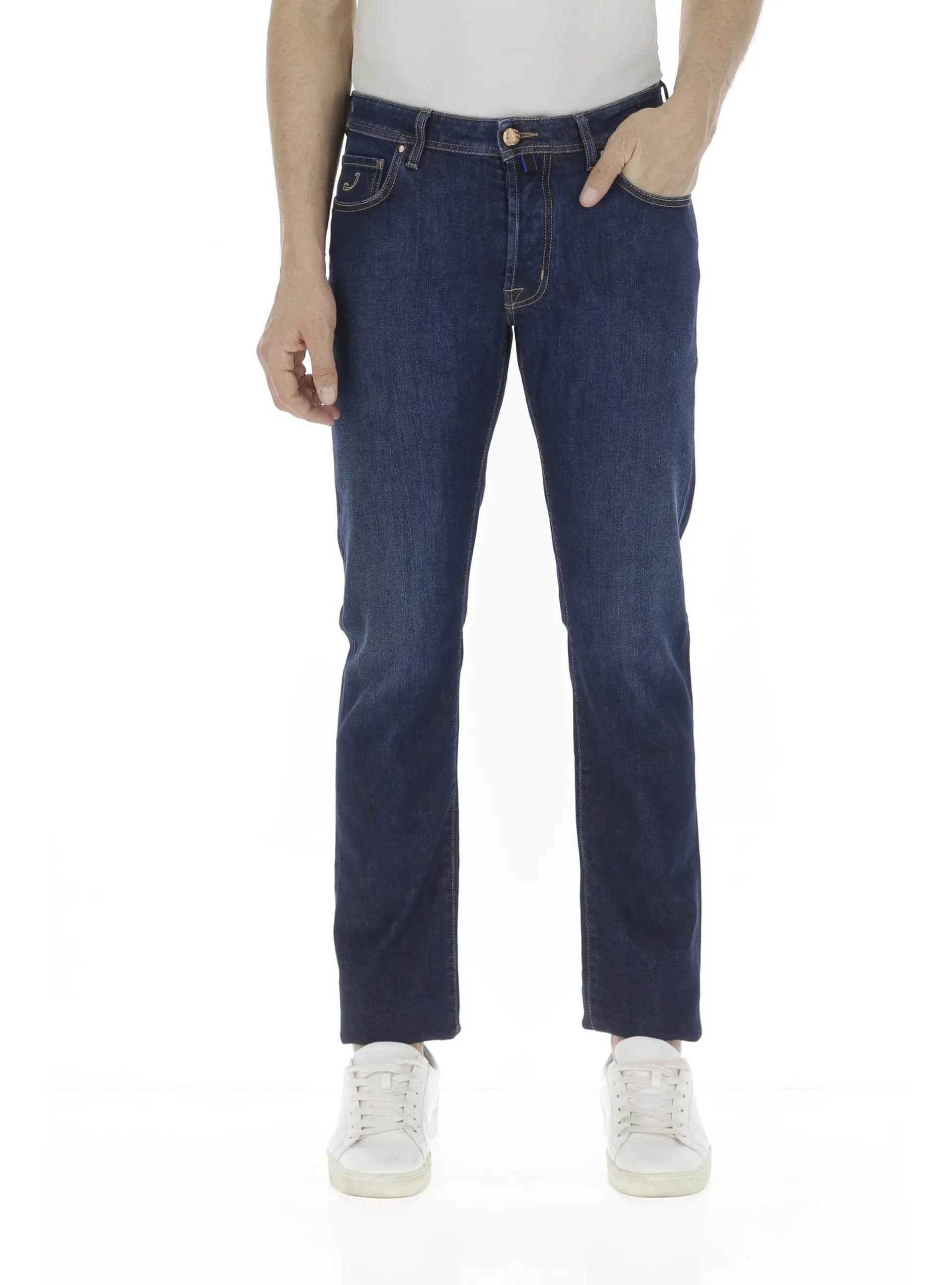 Jacob Cohen denim, blue color, five-pocket design, leather patch on the back, button closure on the front, regular fit. Made in Italy