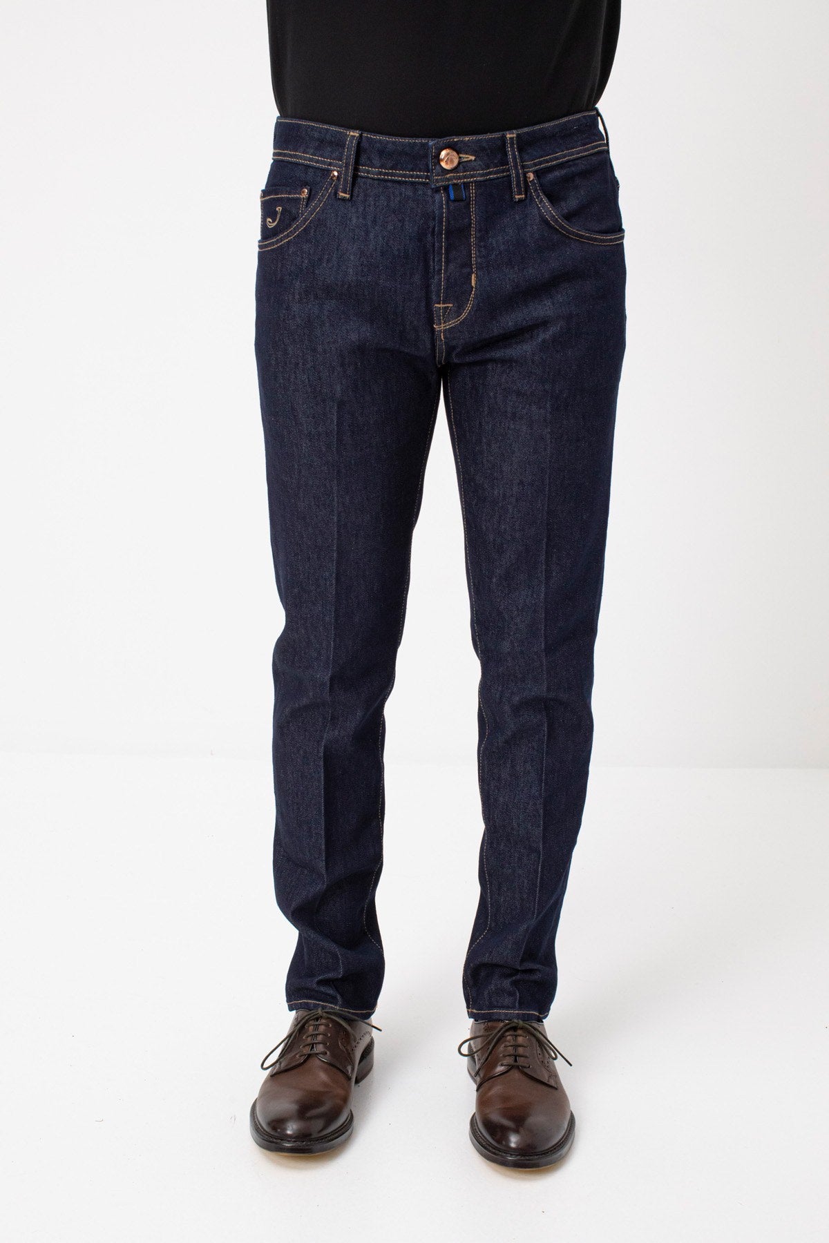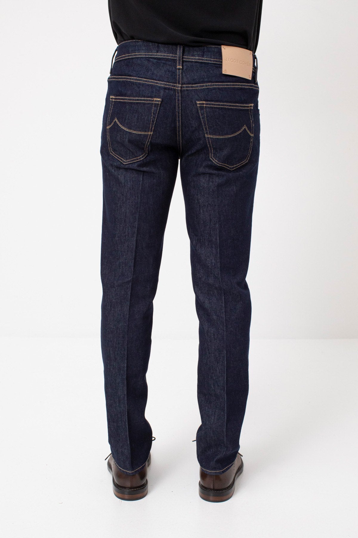 Jacob Cohen denim, blue color, five-pocket design, suede patch on the back, button closure on the front, regular fit. Made in Italy